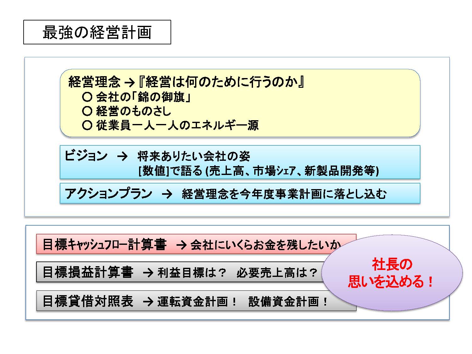 • 経営計画に基づく経営、をサポートを致します。経営計画書は企業の理念(何のために経営を行うか)を具体的な形にしたものといえます。「将来ありたい会社の姿」を数値で表した、『夢の実現計画書』 といえるでしょう。