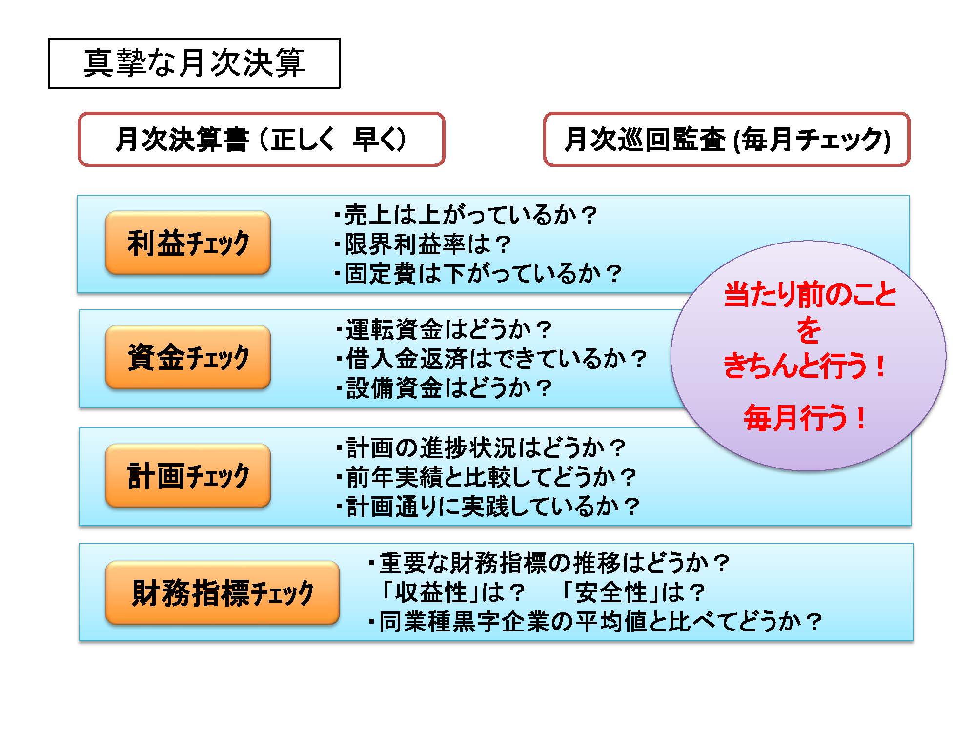• そのために、月次決算が重要となります。税理士による月次巡回監査により月次決算を確定し、